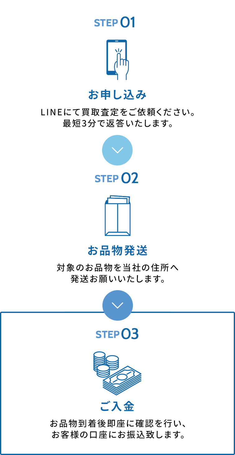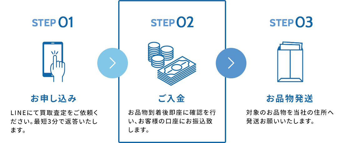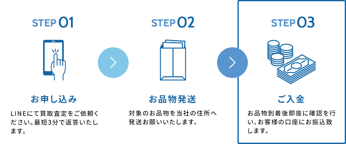 当店のサービスでは、煩雑な手続きや店舗への来店は一切不要。お申し込み時、当店のLINEアカウントを登録し、必要な情報を送信するだけで即日に査定結果と買取金額をご案内いたします。