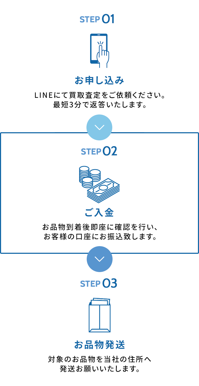 当店のサービスでは、煩雑な手続きや店舗への来店は一切不要。お申し込み時、当店のLINEアカウントを登録し、必要な情報を送信するだけで即日に査定結果と買取金額をご案内いたします。